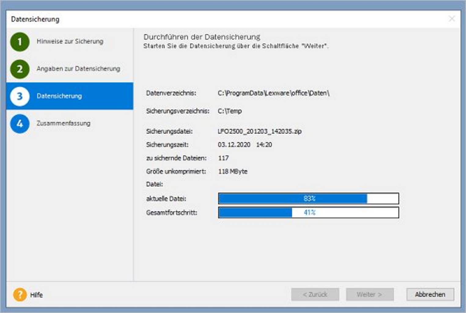 Im Lexware-Programm den Menüpunkt „Datei – Datensicherung“ auswählen. Der Assistent zur Datensicherung öffnet sich, in dem die Online-Datensicherung gewählt werden kann.