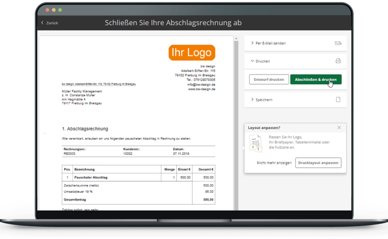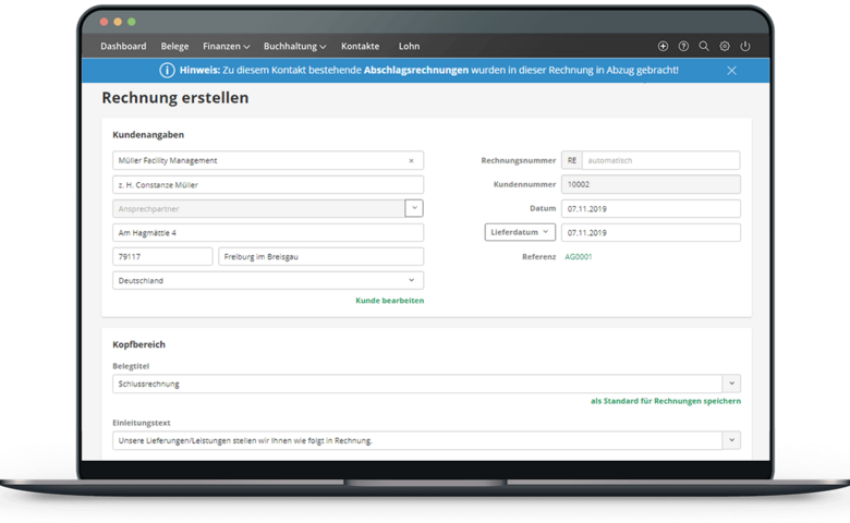 Offizielle Abschlagsrechnungen für einen Vorschuss mit wenigen Klicks schreiben und die finale Schlussrechnung daraus erstellen.