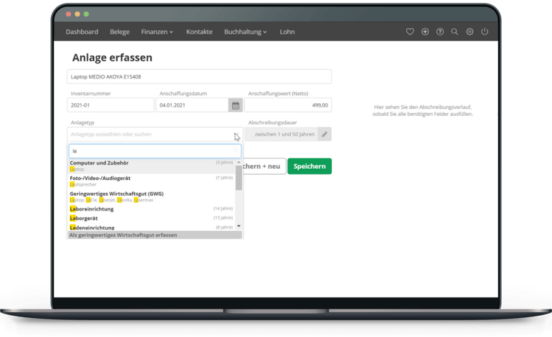 Lexware Office schlägt dir automatisch die richtige Kategorie vor und berechnet den Abschreibungsbetrag.