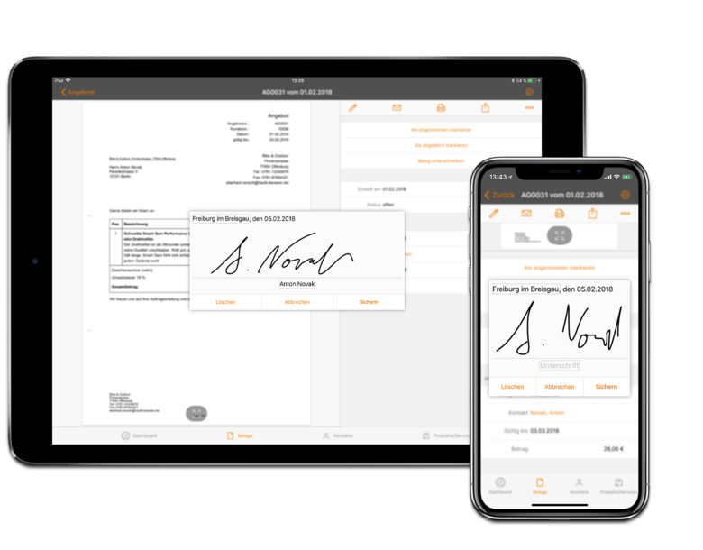 Lieferscheine und Angebote kannst du auf allen iPhone-, iPad- und Android-Geräten von deinen Kunden unterschreiben lassen. Die Unterschrift wird direkt in das PDF eingefügt und Angebote mit Unterschrift werden automatisch als „angenommen“ markiert.