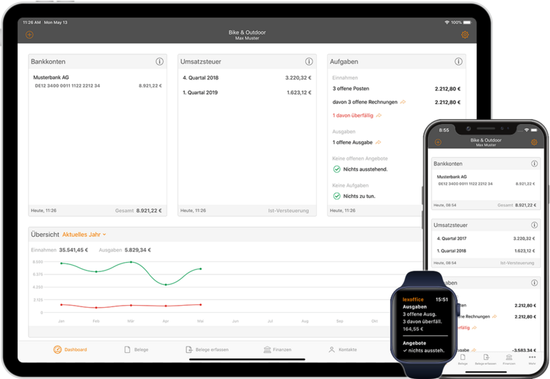 Rufe über das Dashboard deinen Kontostand ab, prüfe Aufgaben oder sieh überfällige Angebote und Rechnungen ein – auch über deine Apple Watch.