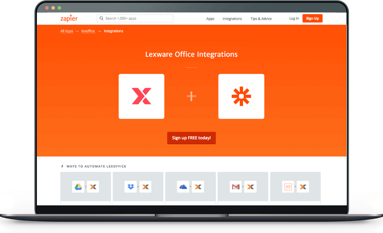 Lädst du einen neuen Beleg z. B. in Google Drive hoch, importiert Zapier diesen Beleg automatisch in Lexware Office. Zapier lässt sich u. a. an Google Drive, Dropbox, OneDrive, Box und OwnCloud anbinden.