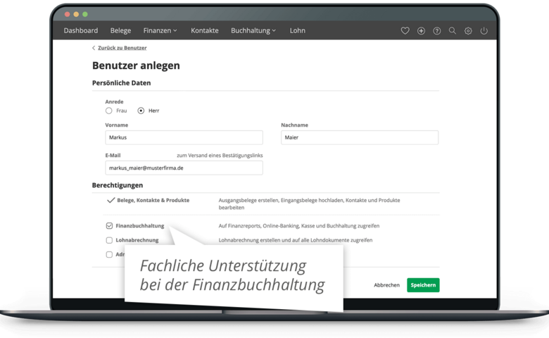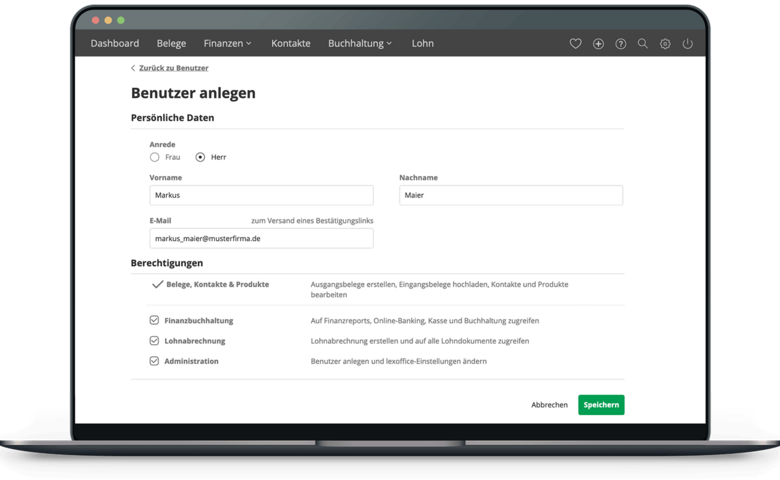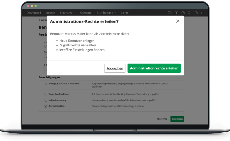 Bestimme, welche Zugriffs- und Bearbeitungsrechte der Benutzer erhält – vom einfachen Beleg bis zur Finanzbuchhaltung.