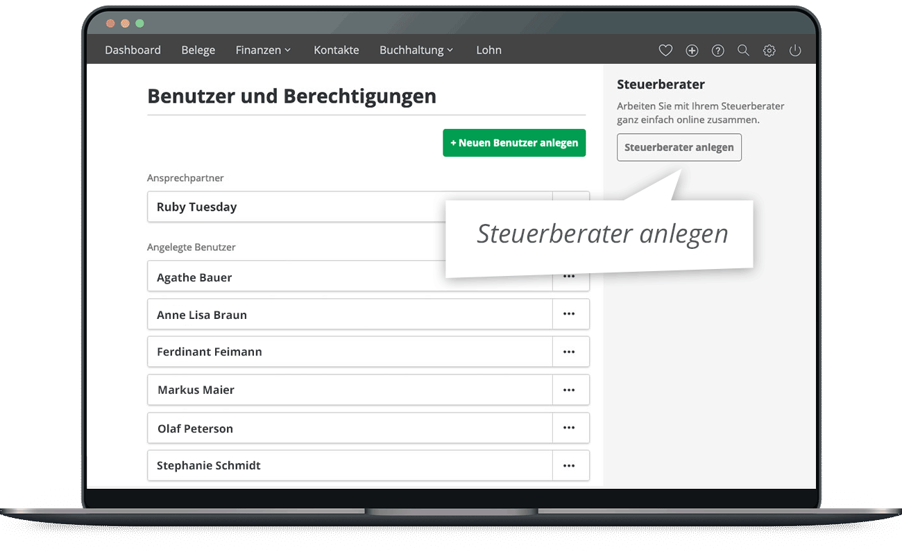 - Mit dem Steuerberater-Zugang einfach Zugriff auf Daten gewähren