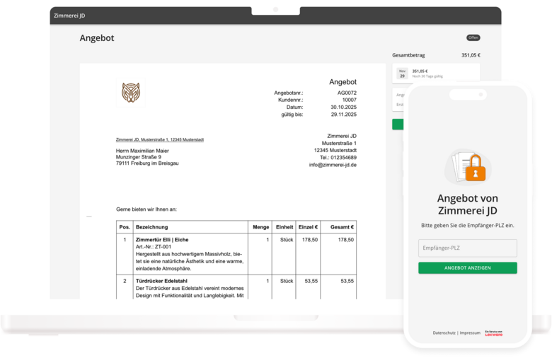 Dein Kunde erhält den Link zum Kundencenter. Mit seiner Postleitzahl autorisiert er sich schnell und sicher und hat sofort Zugriff auf seine Angebote und Rechnungen. Komfortabel kann er das aktuelle Angebot ansehen – auch mobil auf dem Smartphone.