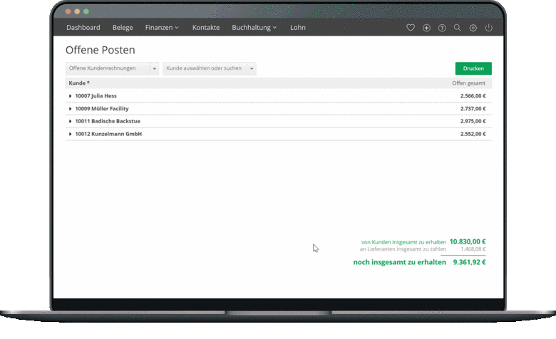 Damit dein Steuerberater dich optimal unterstützen und z. B. die Umsatzsteuer-Voranmeldung korrekt erledigen kann, braucht er eine lückenlose Übersicht über alle noch ausstehenden Zahlungseingänge sowie offene Zahlungsverpflichtungen. Mit Lexware Office kannst du deinem Steuerberater die Offene-Posten-Verwaltung entweder per eigenem Zugang oder über den praktischen Datenaustausch direkt zur Verfügung stellen.