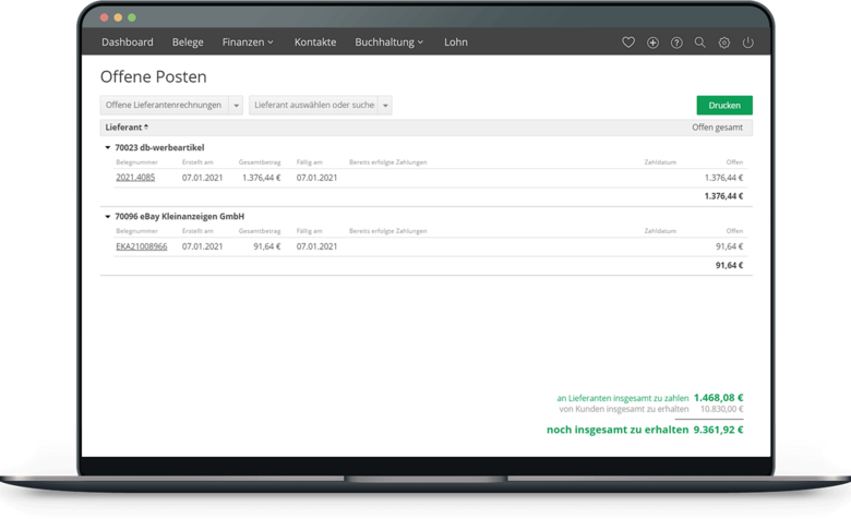 Doch auch deine eigenen Verpflichtungen geraten nicht aus dem Blick: In der Rubrik „Offene Posten“ siehst du jederzeit, welche Eingangsrechnungen an Lieferanten oder Dienstleister noch offen sind. So geht keine Eingangs- oder Ausgangsrechnung verloren.