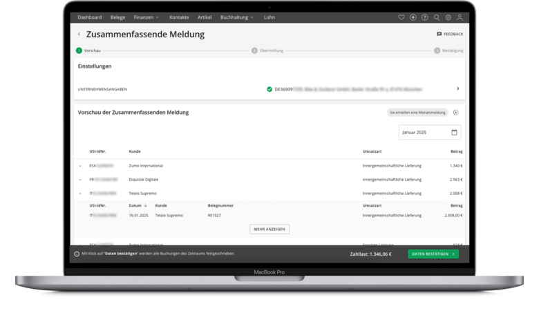 Mit einem Klick übergibst du deine Zusammenfassende Meldung direkt per ELSTER an das Finanzamt.