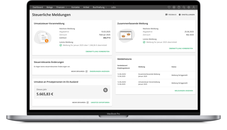Mit dem Steuerliche Meldungen-Hub siehst du, welche Meldungen bereits übermittelt wurden und welche als Nächstes anstehen – so behältst du jederzeit die Kontrolle und kannst schnell reagieren.