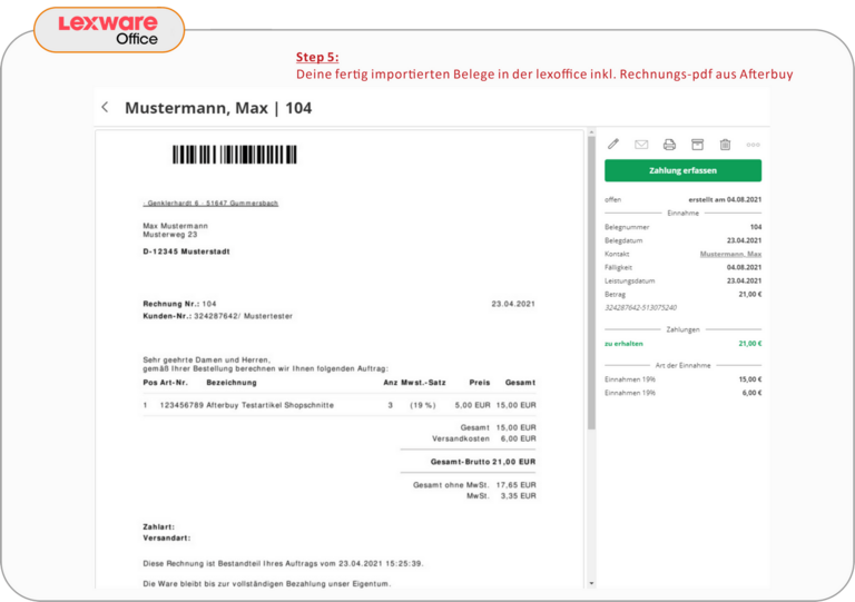 Übertrage Rechnungsdaten (inkl. PDF Beleg) und Kundendaten von Afterbuy nach Lexware Office.