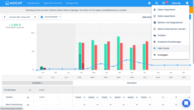 Solltest Du Fragen zu Deiner Liquiditätsplanung mit Agicap haben, steht unser deutschsprachiger Customer-Support gerne zur Verfügung. Wir arbeiten kundenorientiert und antworten über die Chatfunktion unserer Software binnen weniger Minuten mit wertvollen Antworten auf Deine Fragen und Herausforderungen in der Liquiditätsplanung.