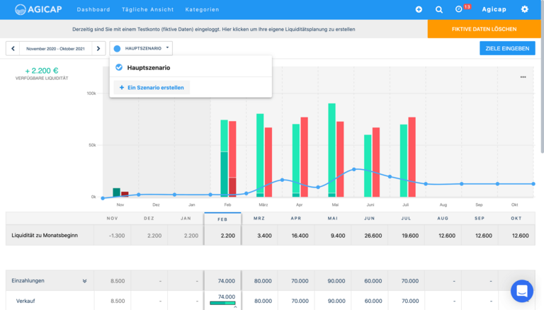 Ob für einen Monat oder mehrere Jahre – Agicap ist sowohl für die langfristige als auch kurzfristige Liquiditätsplanung ausgelegt. Überblick Dein Cash-Management und triff fundierte und sichere Finanzentscheidungen. Dank der ausgereiften Exportfunktionen unterstützt Dich Agicap auch bei der Aufbereitung von Finanzübersichten für eine Kreditanfrage bei Deiner Hausbank. Profitiere sowohl von einer ganzheitlichen Liquiditäts-Historie als auch von zukünftigen Liquiditätsprognosen.
