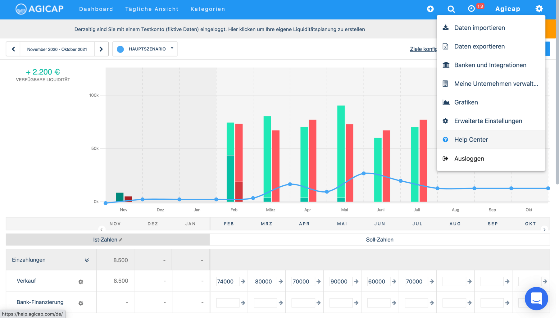 Ob für einen Monat oder mehrere Jahre – Agicap ist sowohl für die langfristige als auch kurzfristige Liquiditätsplanung ausgelegt. Überblick Dein Cash-Management und triff fundierte und sichere Finanzentscheidungen. Dank der ausgereiften Exportfunktionen unterstützt Dich Agicap auch bei der Aufbereitung von Finanzübersichten für eine Kreditanfrage bei Deiner Hausbank. Profitiere sowohl von einer ganzheitlichen Liquiditäts-Historie als auch von zukünftigen Liquiditätsprognosen.