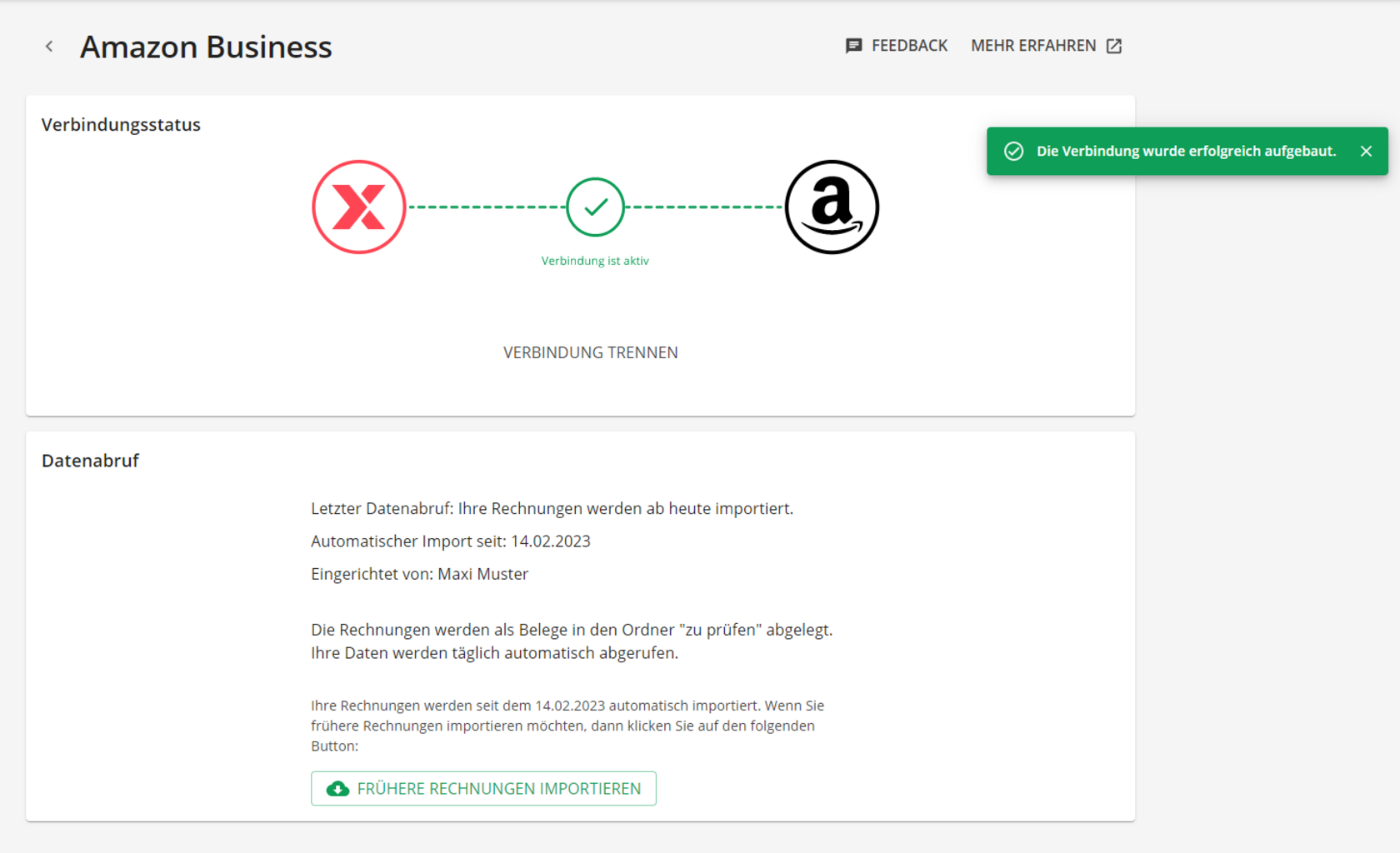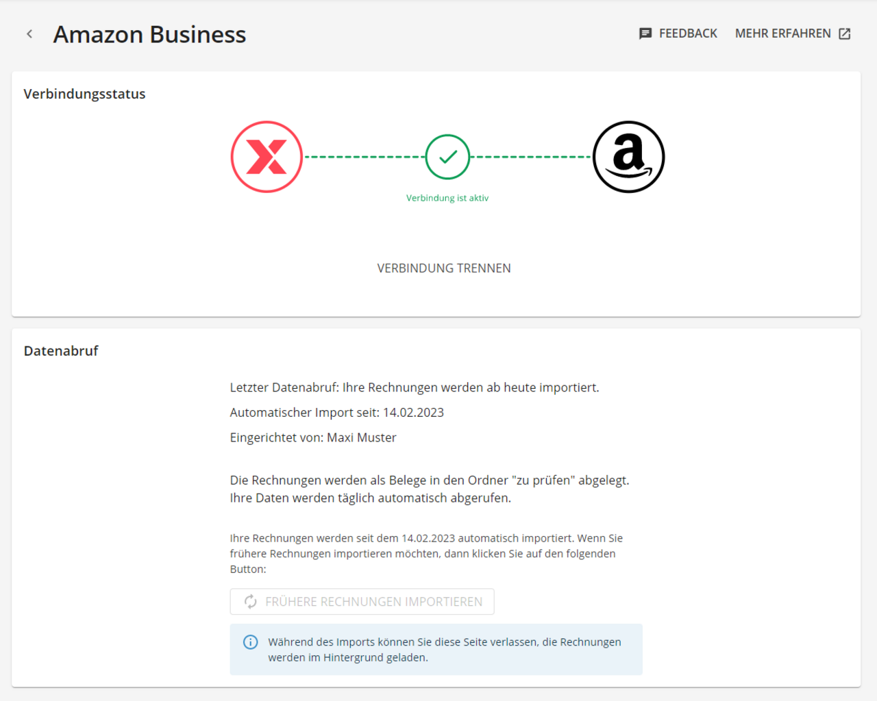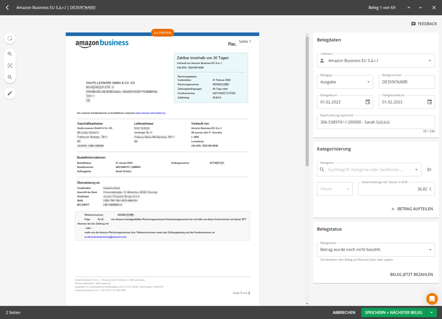 Kurz nachdem eine Amazon Business Rechnung erstellt wurde, importiert die Schnittstelle die Eingangsrechnung in Ihre Lexware Office Buchhaltung.