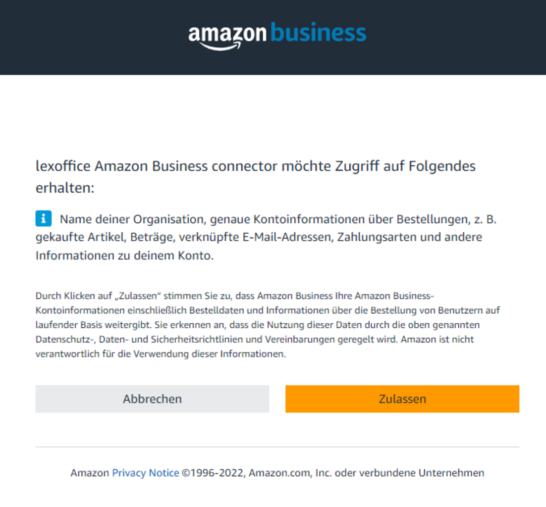 Mit Klick auf “Login mit Amazon” beginnt der Verbindungsaufbau. Dem mehrstufigen Vorgang folgen und auf “Zulassen” klicken. Der Browser wird danach zurück zu Lexware Office geleitet.