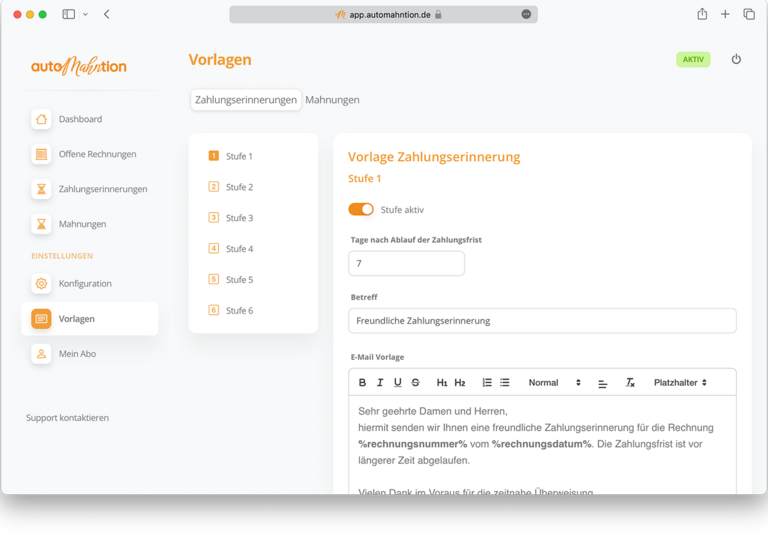 Mit autoMahntion können für ausgehende Rechnungen automatisch Zahlungserinnerungen und Mahnungen versendet werden. autoMahntion bietet dafür verschiedene Einstellungsmöglichkeiten, wie z.B. individuelle E-Mail-Texte und Mahngebühren pro (Mahn-)Stufe.