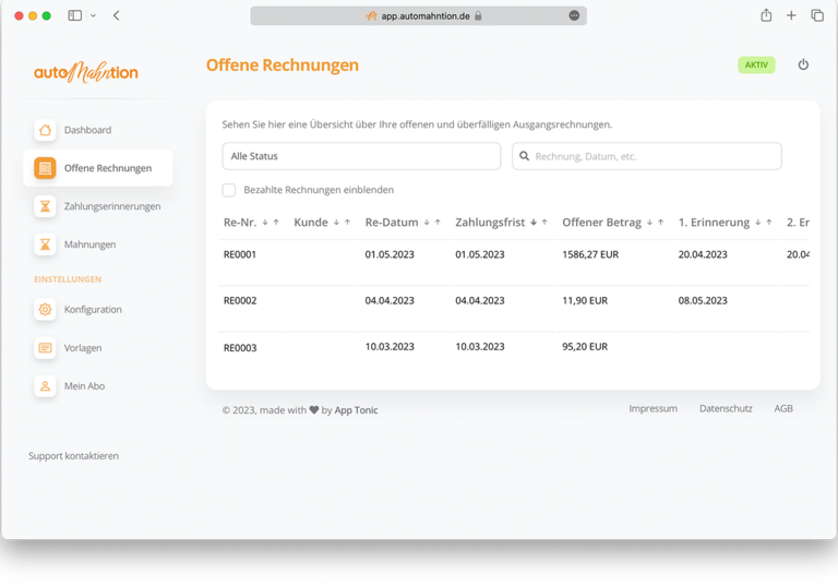 Du behältst zu jeder Zeit die volle Kontrolle und kannst in einem übersichtlichen Dashboard den aktuellen Status jeder überfälligen Rechnung einsehen. - Mahnungen leicht gemacht