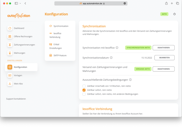 - Los geht’s: Aktiviere die Synchronisation Deiner überfälligen Rechnungen per Knopfdruck und versende Deine ersten automatisierten Zahlungserinnerungen.
