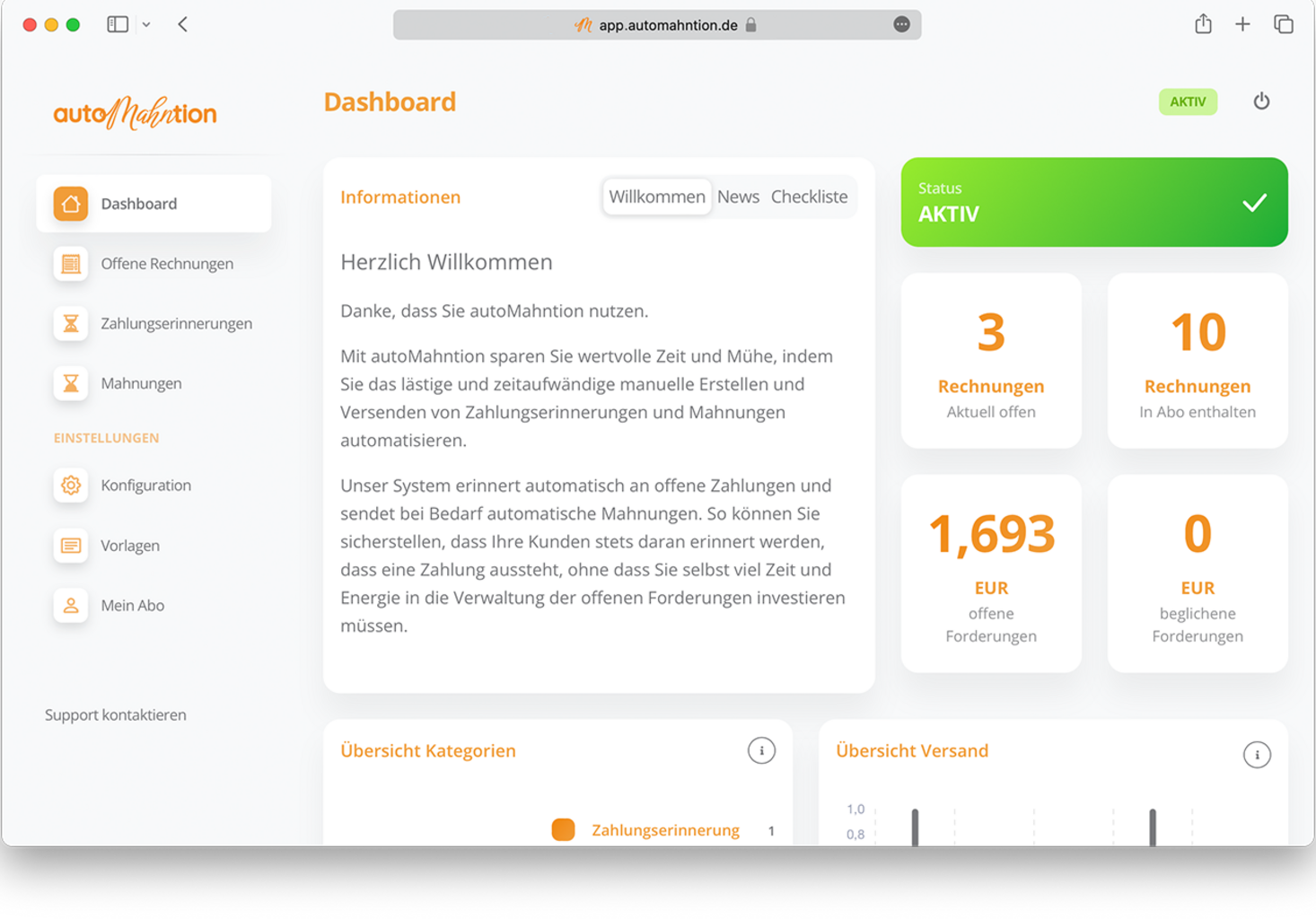 Du behältst zu jeder Zeit die volle Kontrolle und kannst in einem übersichtlichen Dashboard den aktuellen Status jeder überfälligen Rechnung einsehen. - Mahnungen leicht gemacht