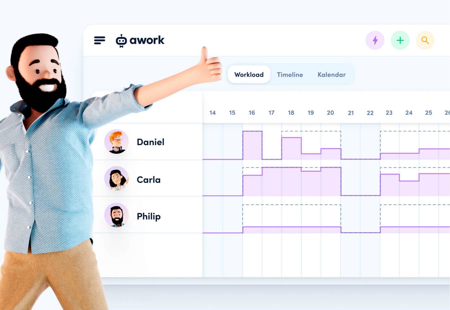 Du willst Leerlauf und Engpässe vermeiden? awork kombiniert die Projektplanung und dem persönlichen Kalender deines Teams. So weißt du jederzeit, wie ausgelastet dein Team in der nächsten Zeit ist, wer aktuell woran arbeitet und wann Urlaube anstehen. Freie Kapazitäten oder Konflikte in deinen Projekten erkennst du sofort in der akkuratesten Workload-Übersicht aller Zeiten. So kannst du z.B. sofort entscheiden, wer dringende To-Dos übernehmen kann und ob ihr noch Kapa für ein neues Projekt habt.
