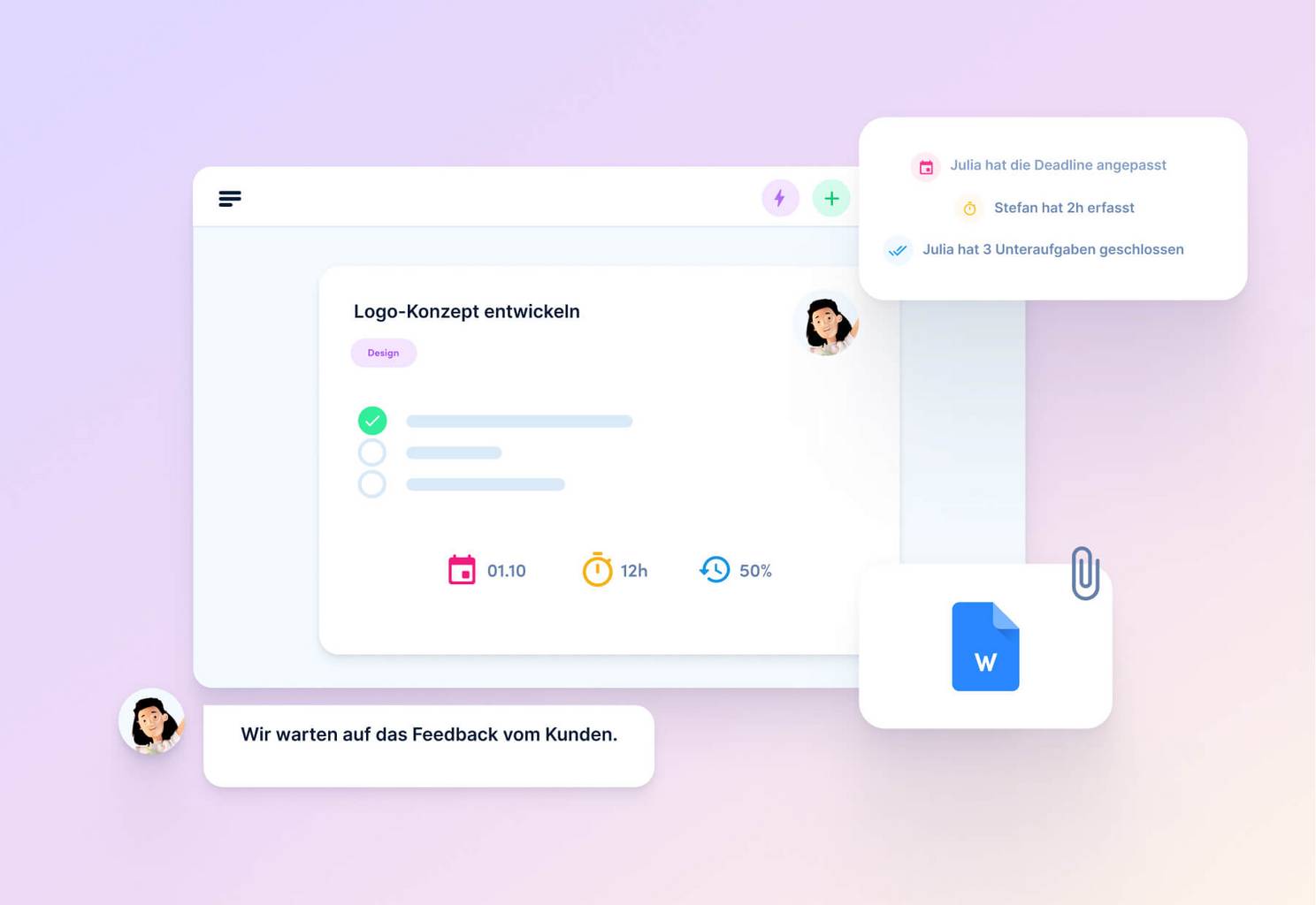 Auch Feedback geht in awork nicht verloren. Im Aufgaben-Chat können Kommentare hinterlassen, Dateien geteilt und User benachrichtigt werden. So sind alle, die am Projekt arbeiten, immer auf dem neuesten Stand – ohne lästige E-Mail-Schleifen. Und die smarten Automatisierungen und Projekt- und Aufgabenvorlagen sparen dir wertvolle Zeit im Projektalltag.