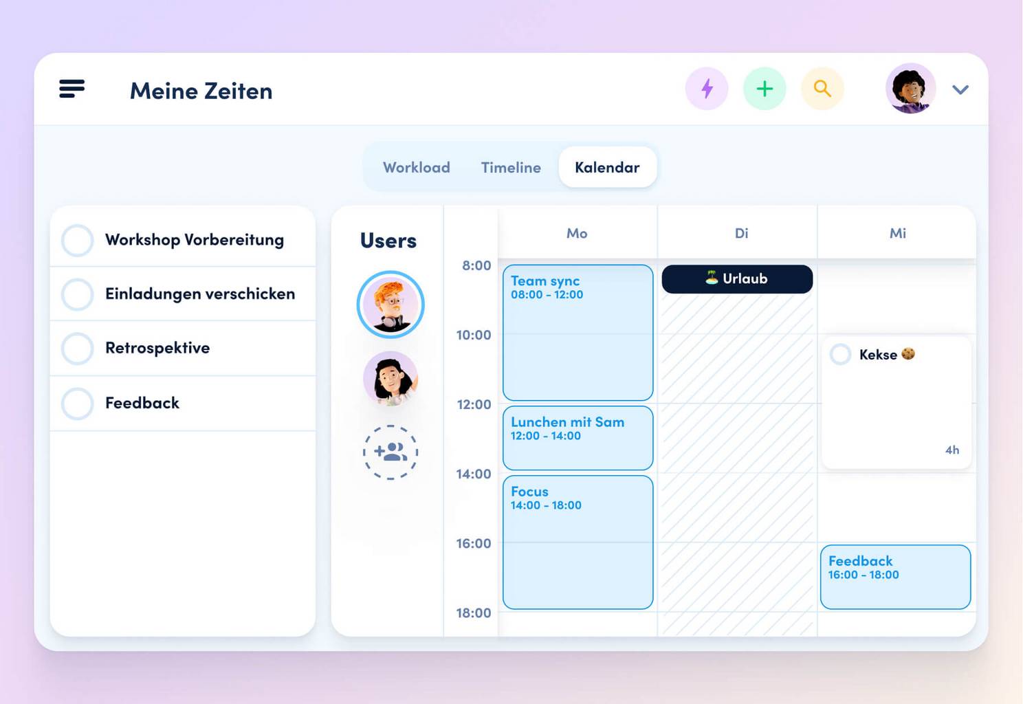 Damit sich Teams und alle Projekte übersichtlich koordinieren lassen, kombiniert awork die Projektplanung mit den persönlichen Kalendern deines Teams. So ist immer klar, wie ausgelastet ein Team ist und Engpässe lassen sich sofort erkennen. Dank visueller Aufgabenplanung wird deutlich, wer was erledigt und wann Deadlines und Abwesenheiten anstehen. Und die Zeiterfassung ist direkt in die Team-Orga integriert.