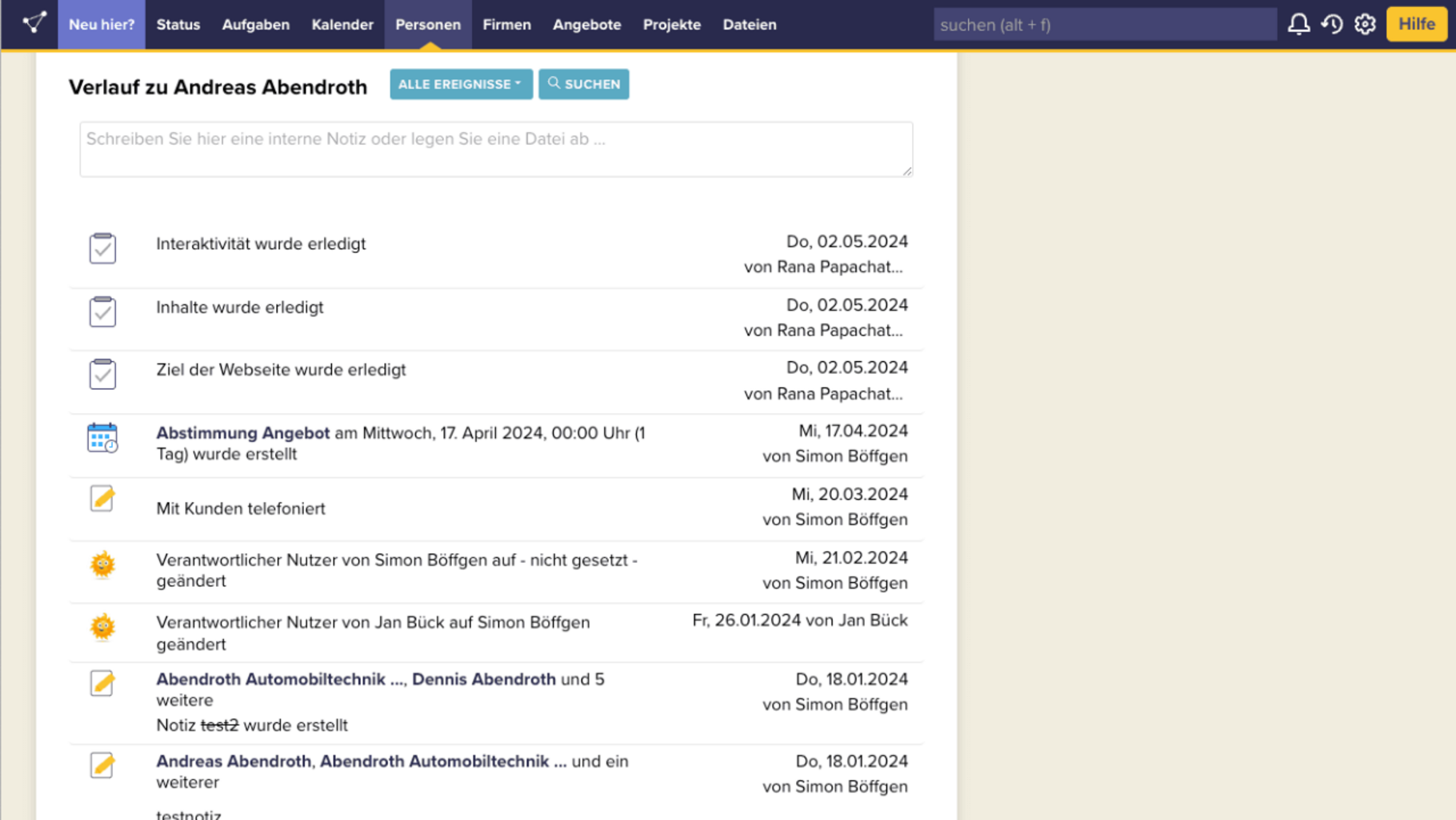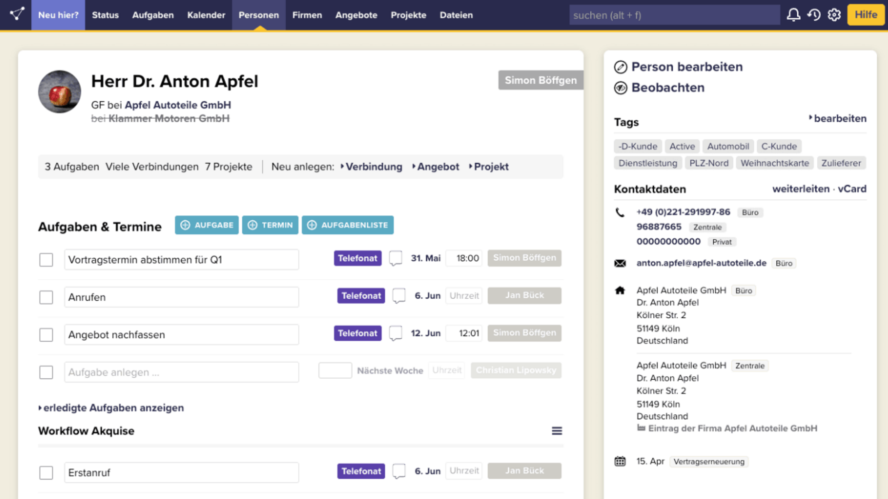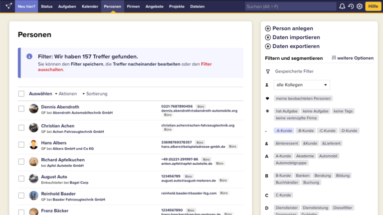• Alle Kundendaten befinden sich an einem Ort: Adressen, E-Mails, Termine, Notizen, ToDos, Verträge, Angebote