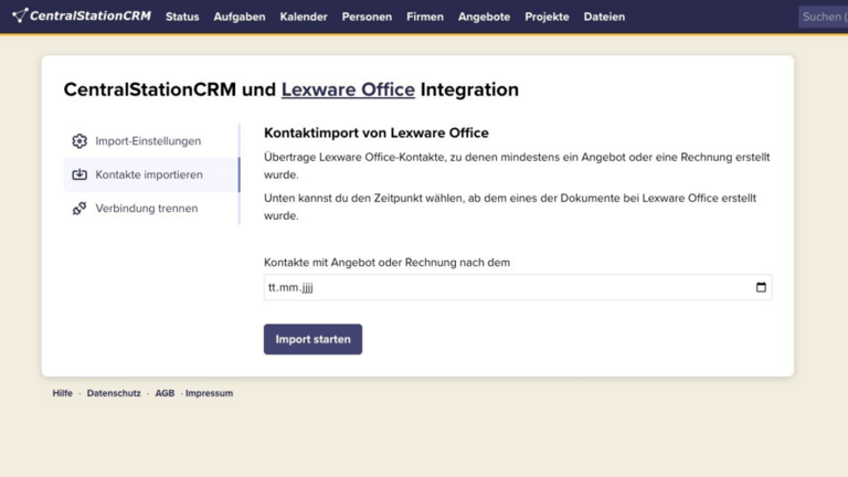 Es benötigt nur ein paar Klicks, um CentralStationCRM mit Lexware Office zu verbinden. Gehe wie folgt vor: