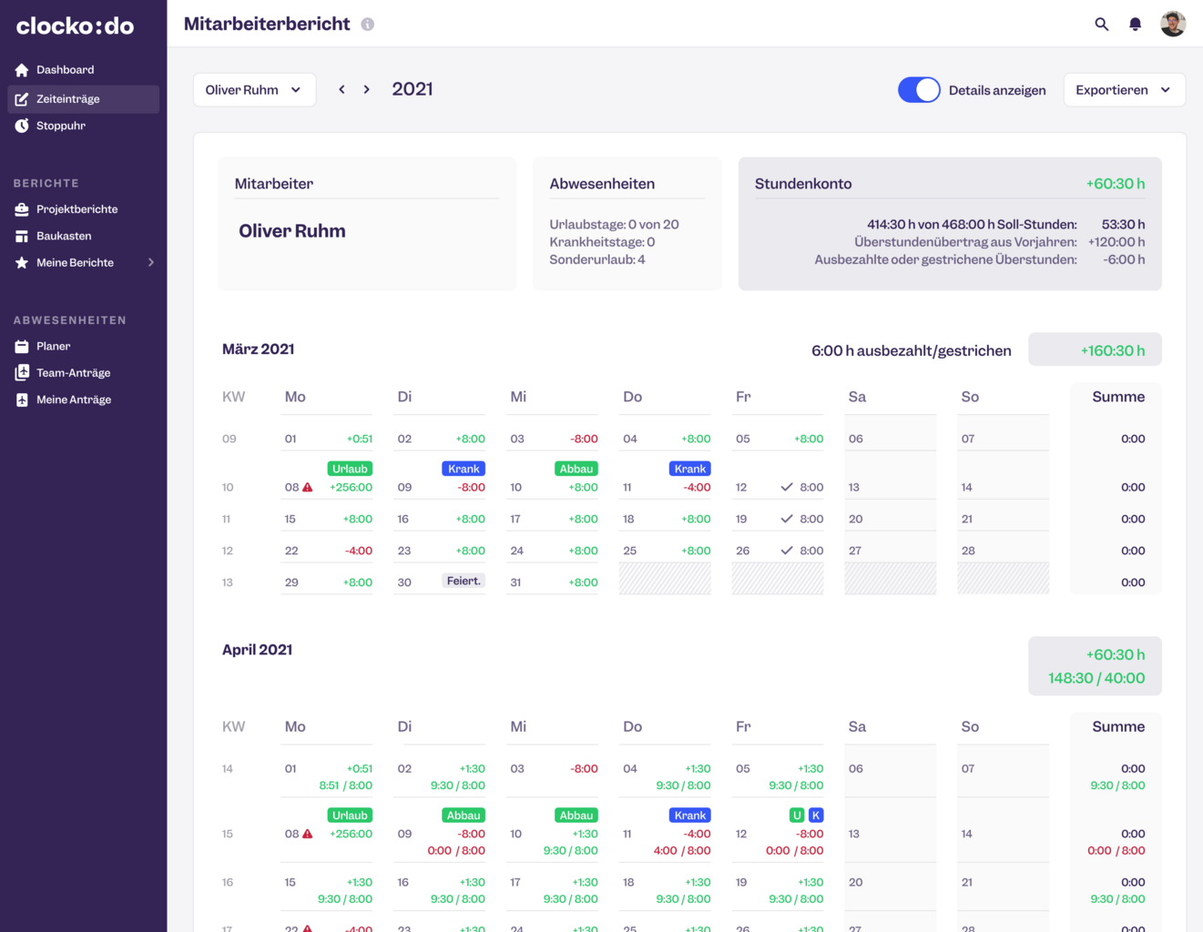 - Mitarbeiter-Management für Urlaubszeiten, Überstunden, Soll- und Ist-Zeiten