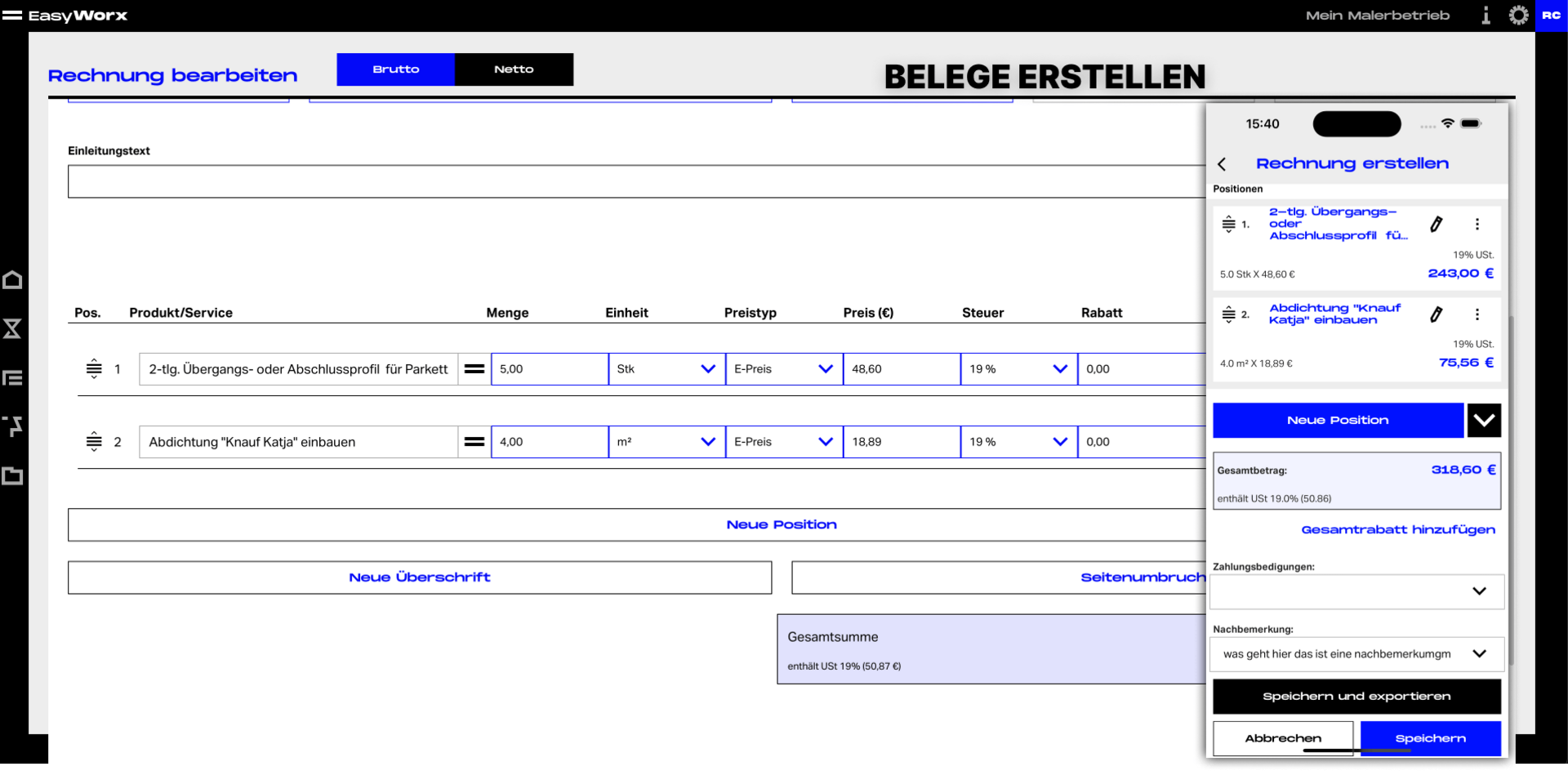- Dokumente: Professionelle Abrechnung leicht gemacht – Mit unseren Belegfunktionen in EasyWorx erstellst du Angebote und Rechnungen im Handumdrehen, um deine Kunden zu beeindrucken und den Geschäftsprozess zu optimieren. Intelligente Finanzabwicklung für den Handwerker von heute.