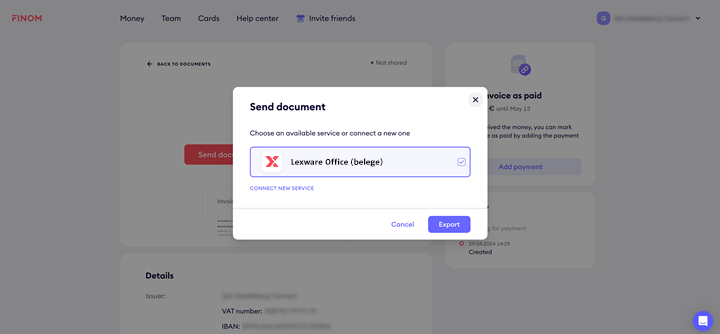 Du musst keine CSV-Dateien importieren oder Daten manuell übertragen – öffne einfach Deine Rechnung oder Deinen Beleg in der Finom-App und klicke auf „Exportieren“. Sie werden automatisch an Lexware Office gesendet und dort sicher gespeichert. Das war’s!