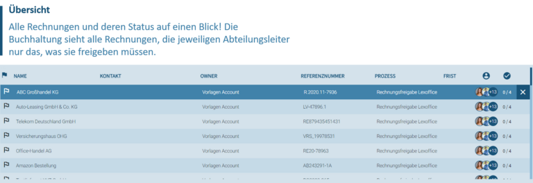 Die Flowers-Software Integration ermöglicht es, Rechnungen vollständig digital freizugeben – ohne Unterschriftsmappen, Stempel oder Hauspost. Eine Prozess-Vorlage von Flowers kann direkt genutzt oder der Freigabeablauf individuell angepasst werden. Betragsgrenzen für zusätzliche Freigaben, etwa durch die Geschäftsführung, lassen sich einfach festlegen. Der frühere Stempel kann 1:1 digital in Flowers übertragen werden. Belege können manuell hochgeladen oder per Postfach-Automatisierung importiert werden. Noch heute starten und die erste Rechnung digital mit Flowers freigeben!