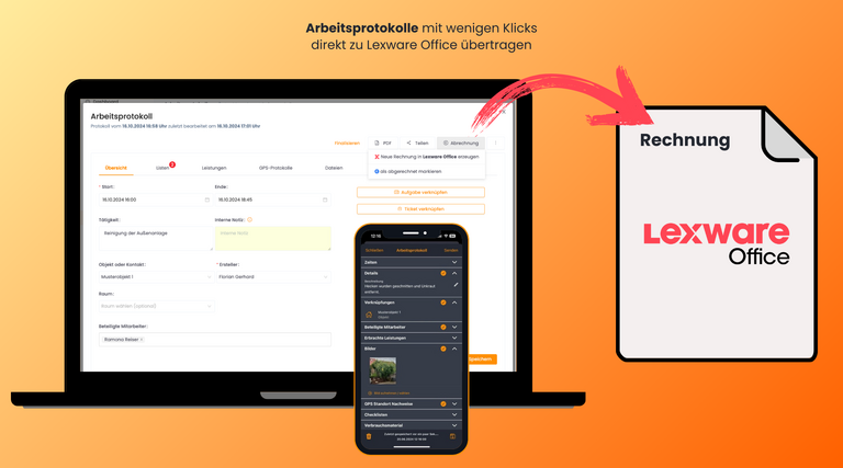 Kundendaten und Artikel können mit nur einem Klick in die Hausmeisterapp übertragen werden, wodurch doppelte Datenpflege entfällt. Lexware Office bleibt wie gewohnt nutzbar, während Planung und Organisation von Aufträgen in der Hausmeisterapp fortgesetzt werden können. Mitarbeiter lassen sich Aufgaben zuweisen, Arbeitszeiten erfassen, Tickets abarbeiten und Arbeitsprotokolle erstellen. Die Abrechnung erfolgt anschließend wie gewohnt über Lexware Office.