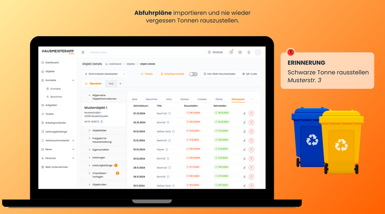 - Objektverwaltung mit Abfuhrplänen, Zählern, Dateien, Kontakten etc.