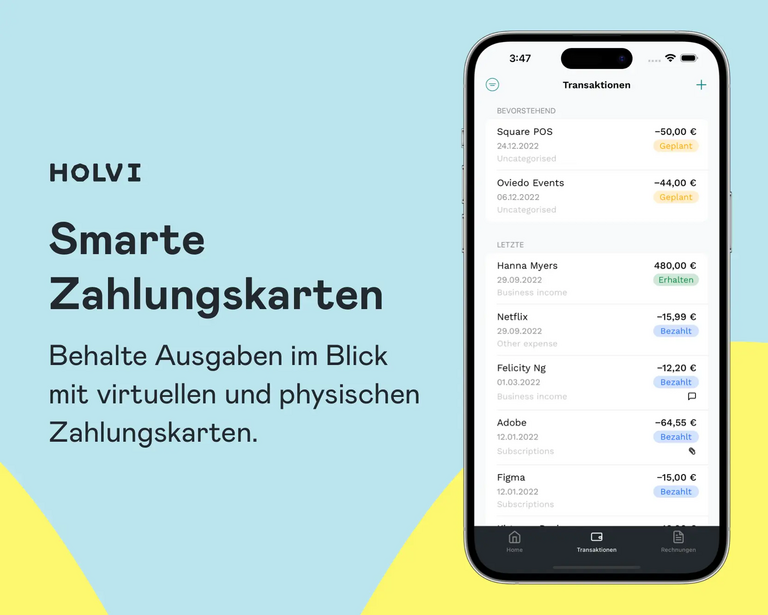 Holvi ist das smarte Geschäftskonto mit deutscher IBAN. Einfach in Sekunden eine virtuelle Karte erstellen und geschäftliche Ausgaben bequem mit Apple Pay oder Google Pay bezahlen. Auch eine klassische Holvi Debitkarte ist in allen Kontomodellen enthalten. Im Holvi Geschäftskonto fällt es leicht, den Überblick über alle Transaktionen zu behalten. Mit der optionalen Verkaufsseite können digitale Produkte und Dienstleistungen einfach verkauft werden – ganz ohne technische Vorkenntnisse.