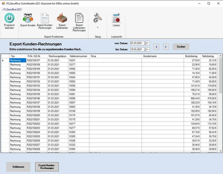 Die in der JTL-WAWI erzeugten Kundenrechnungen bzw. Gutschriften werden über einen frei definierten Zeitraum ausgewählt und inklusive der von der JTL-WAWI erzeugten Belegbilder nach Lexware Office übertragen.