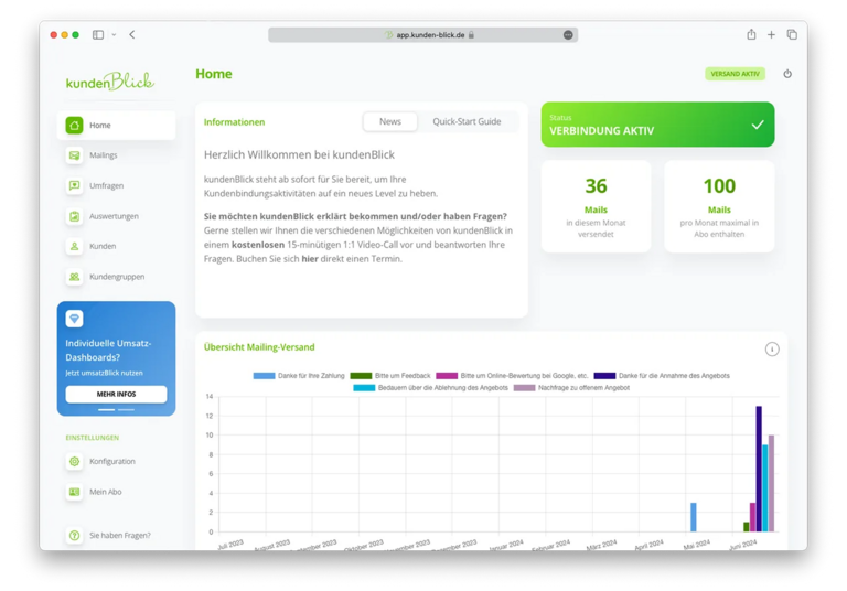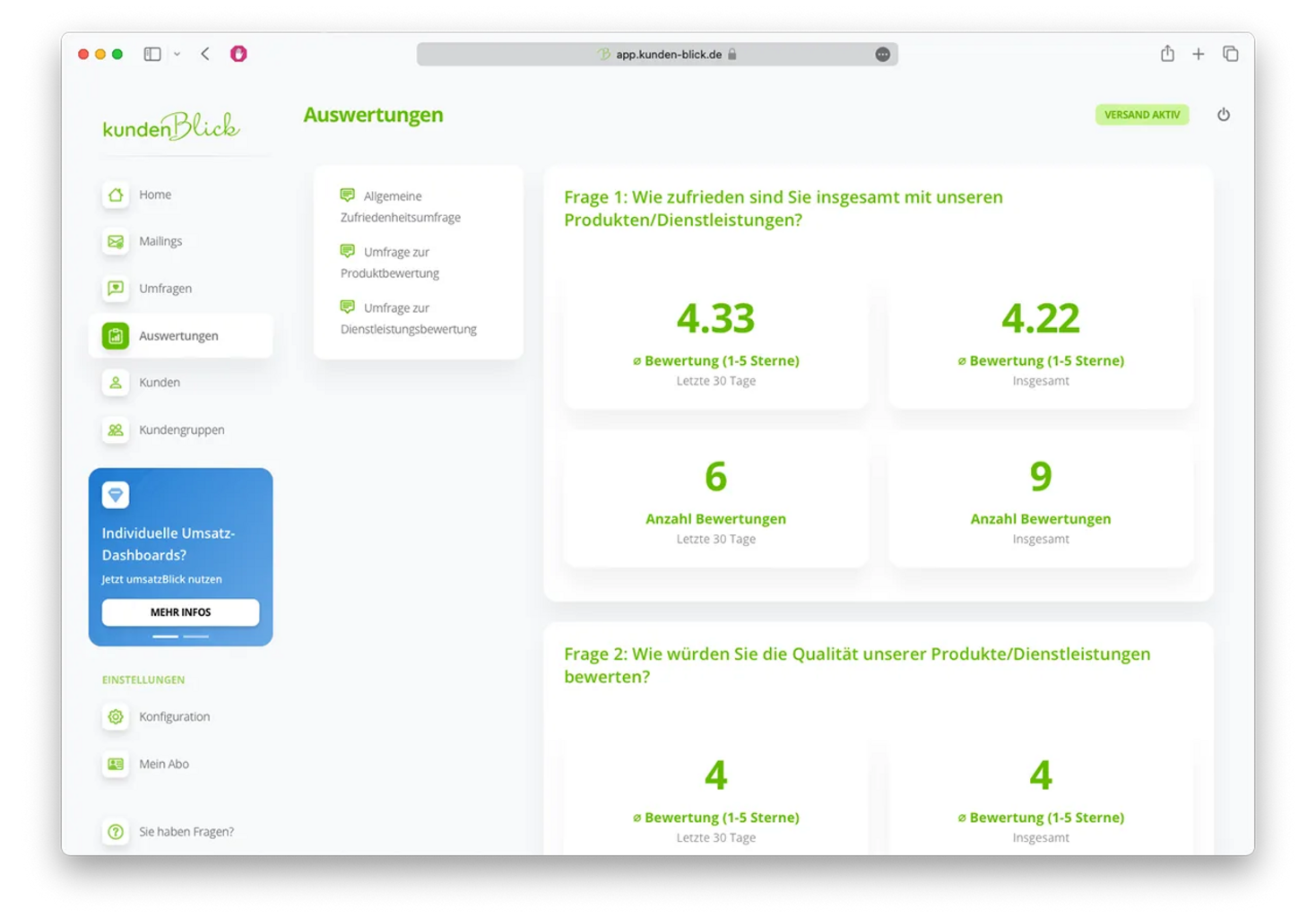 Mit Hilfe von kundenBlick kannst Du nicht nur die Kundenbindung stärken, sondern auch wertvolles Kundenfeedback sammeln und auswerten. Durch unsere Umfrage-Funktion kannst Du beliebig viele Umfragen mit unbegrenzt vielen Fragen erstellen (z.B. eine allgemeine Zufriedenheitsumfrage oder eine Umfrage für ein konkretes Produkt) und diese in Deine Mailing-Vorlagen einbinden. Durch die Auswertungsfunktion kannst Du das anonyme, ehrliche Feedback jederzeit einsehen und Optimierungsmaßnahmen daraus ableiten. Damit hast Du die Chance, Dein Unternehmen, Deinen Service und Deine Produkte stetig zu verbessern.