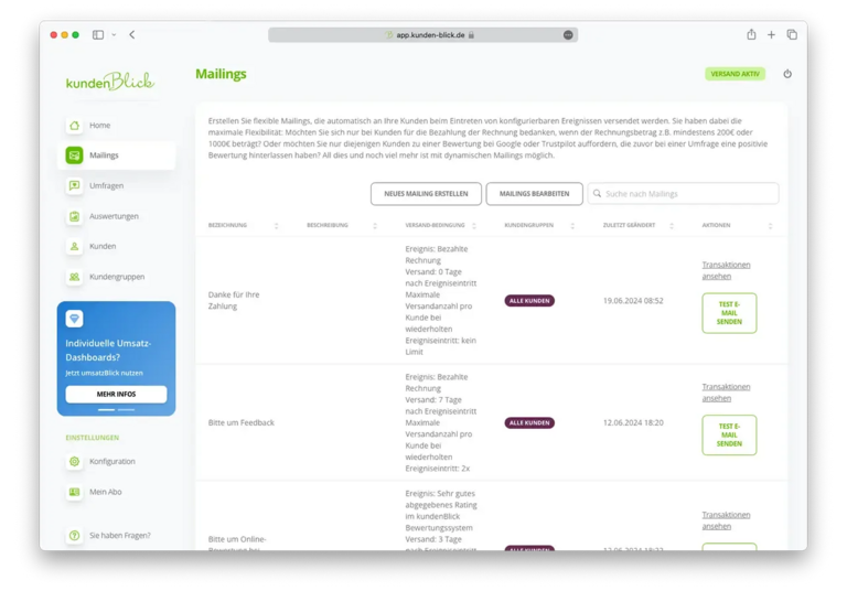- Mehrstufige und automatisierte Mailings stärken die Bindung zu Bestandskunden, liefern wertvolles Kundenfeedback und verbessern die Online-Reputation – alles ohne Mehraufwand, was den Weg zu höheren Umsätzen ebnet.