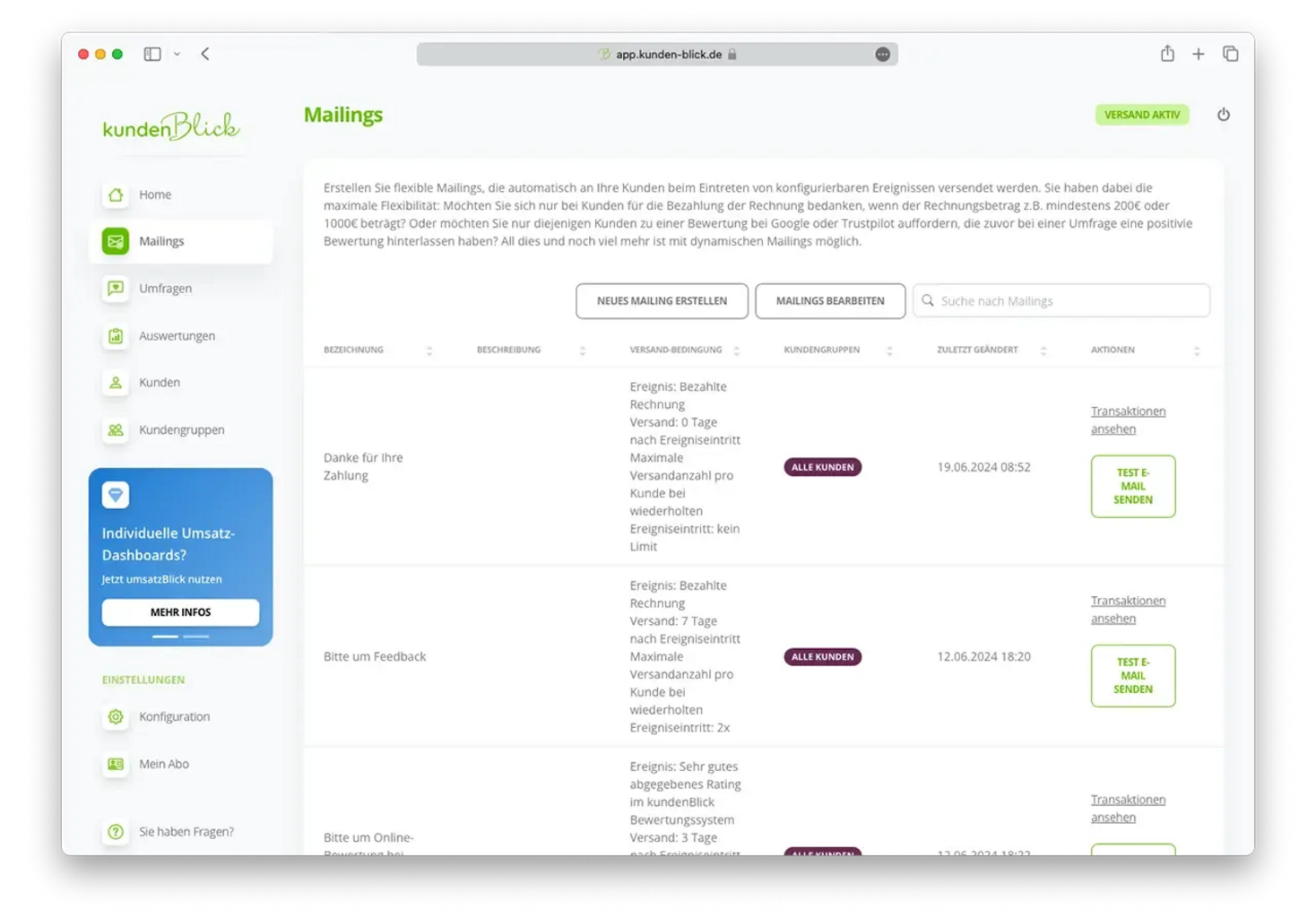 - Los geht’s: Aktiviere den automatischen Versand und deine Mailings werden je nach eingestelltem Trigger (z.B. wenn eine Rechnung bezahlt wurde) an deine konfigurierten Kundengruppen (z. B. nur an Kunden mit einem gewissen Umsatz) versendet.