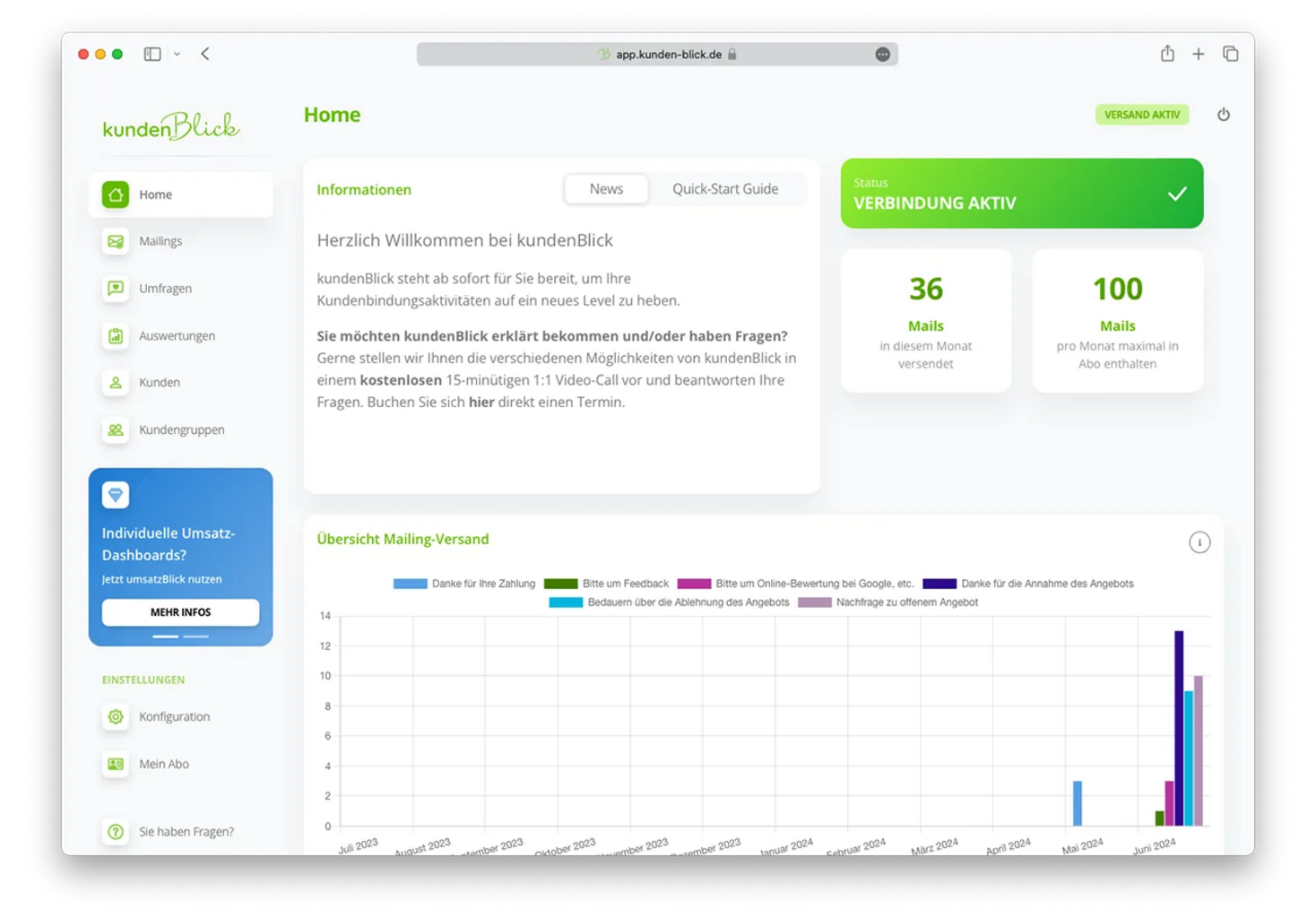 Aktuell ist es sehr mühsam, zeit- und kostenintensiv, Deinen Bestandskunden die Aufmerksamkeit zu schenken, die sie verdienen. Viele, insbesondere kleine und mittlere Unternehmen, verzichten deshalb weitestgehend darauf und verpassen dadurch die große Chance, die Bindung zu ihren Bestandskunden zu stärken. Diese Bindung ist entscheidend dafür, ob ein Bestandskunde in Zukunft nochmal einen Einkauf in Deinem Unternehmen tätigt bzw. einen Folgeauftrag vergibt. Du kannst also durch eine verbesserte Kundenbindung Deine Umsätze steigern. Welcher Unternehmer möchte keine höheren Umsätze? Nutze Deine Chance und automatisiere diesen wichtigen Prozess mit kundenBlick vollständig!