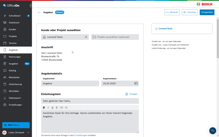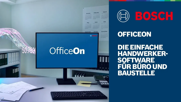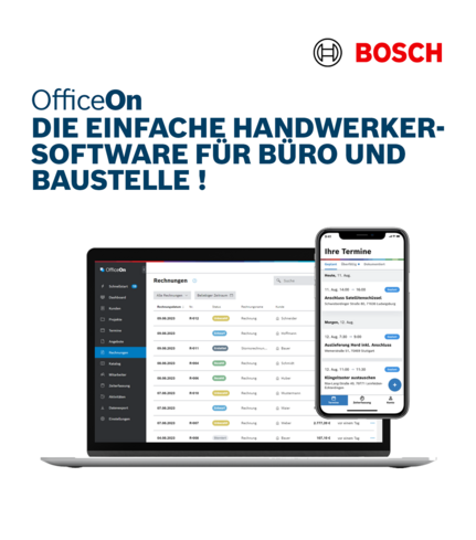 Bosch OfficeOn ist die einfache Handwerkersoftware mit mobiler App. Erledige Angebote, Rechnungen, Terminkoordination, Zeiterfassung und Dokumentation einfacher denn je!