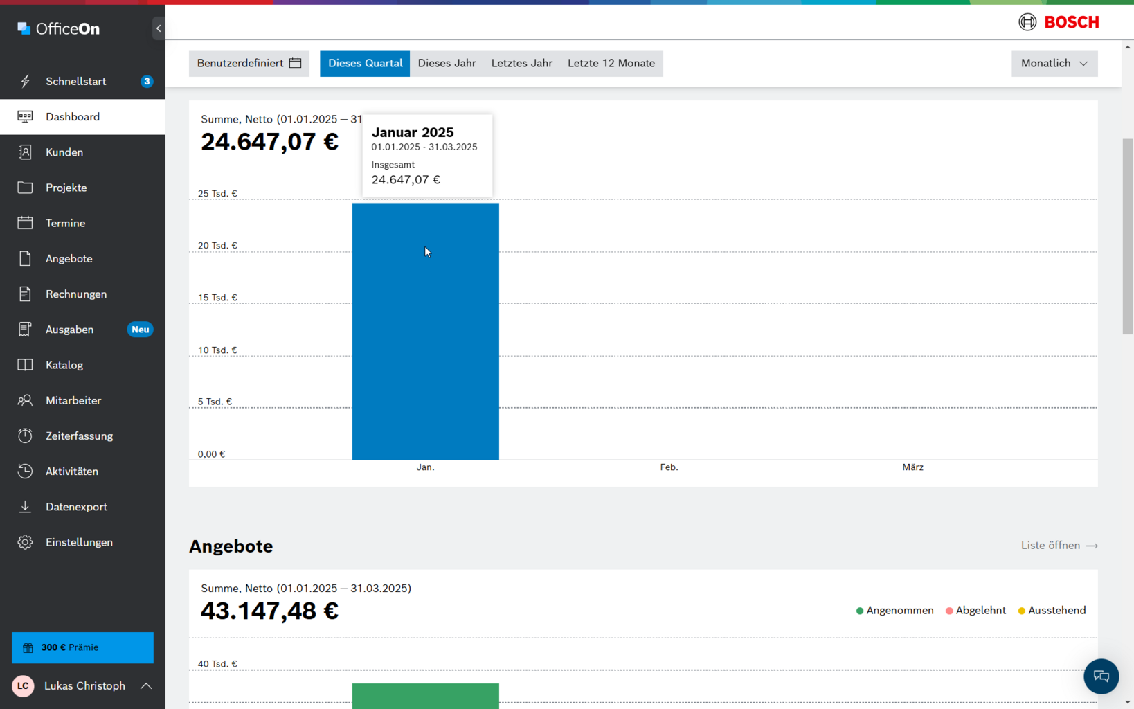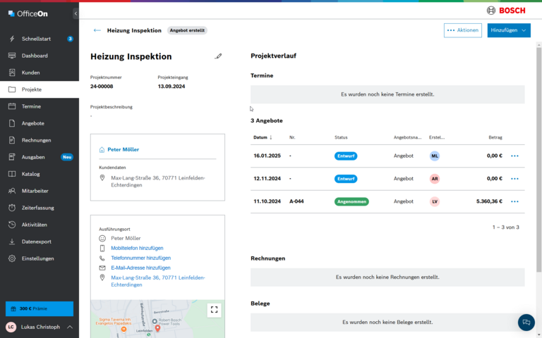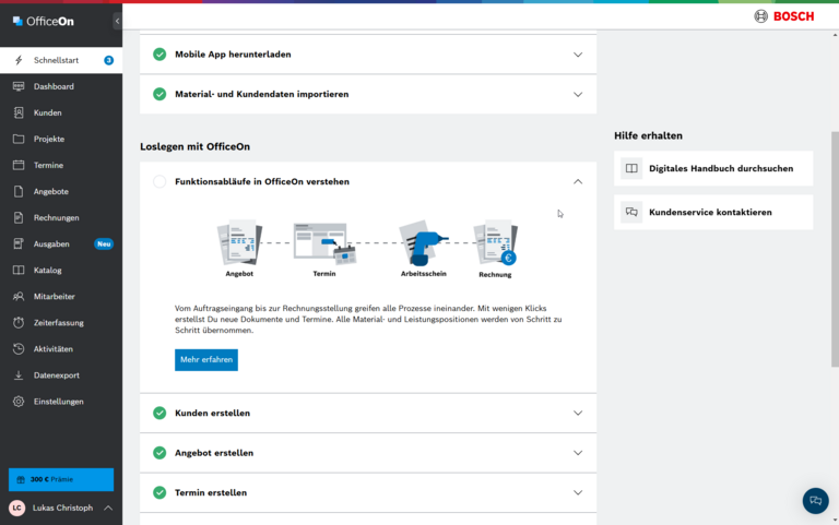 Bosch verfügt über jahrzehntelange Erfahrung im Handwerk und bietet innovative und zuverlässige Lösungen für Handwerker aller Gewerke. Die Handwerkersoftware OfficeOn von Bosch zeichnet sich durch ihre Funktionen und benutzerfreundliche Bedienung aus. Sie unterstützt dich bei der Planung und Durchführung von Projekten, der Terminkoordination sowie dem Erstellen von Angeboten und Rechnungen und hilft dir somit, die Abläufe in deinem Handwerksbetrieb zu beschleunigen und zu vereinfachen. Zudem bietet Bosch umfassenden Support und regelmäßige Updates, sodass du immer auf dem neuesten Stand bleibst.