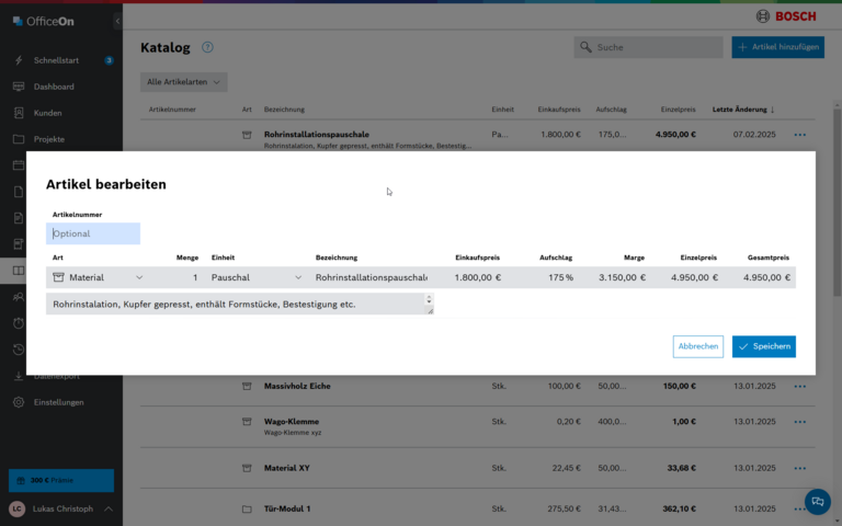 OfficeOn von Bosch ist die einfache Handwerkersoftware für Büro und Baustelle. Von der Angebots- bis zur Rechnungserstellung, Projektmanagement, Zeiterfassung und Terminkoordination. OfficeOn bietet dir alle Funktionen, die du als Handwerker in deinem Arbeitsalltag brauchst, auf einer einfachen, intuitiven Oberfläche.