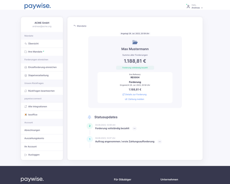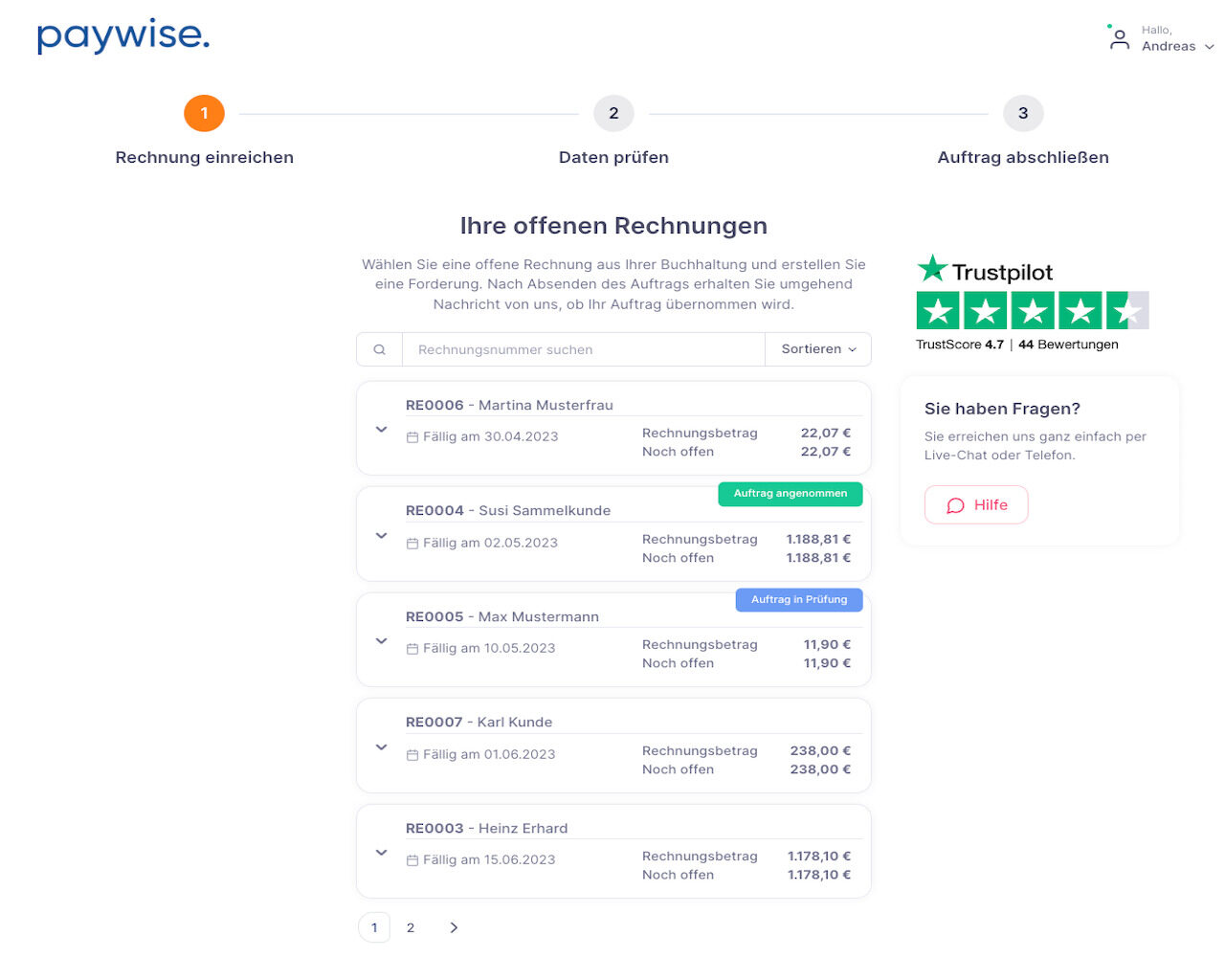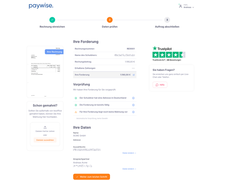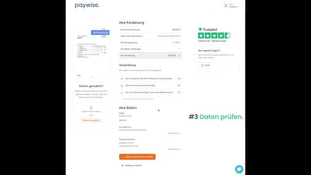 Nutzen Paywise erfolgreich seit Monaten. Einleitung der Forderungseintreibung klappt problemlos und verläuft transparent. Nachverfolgung vom Status der Forderung sieht man im Dashboard bzw. per API.