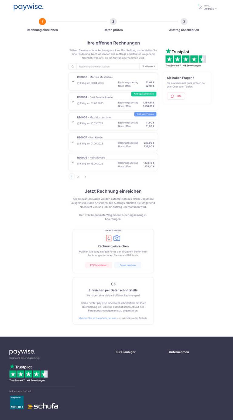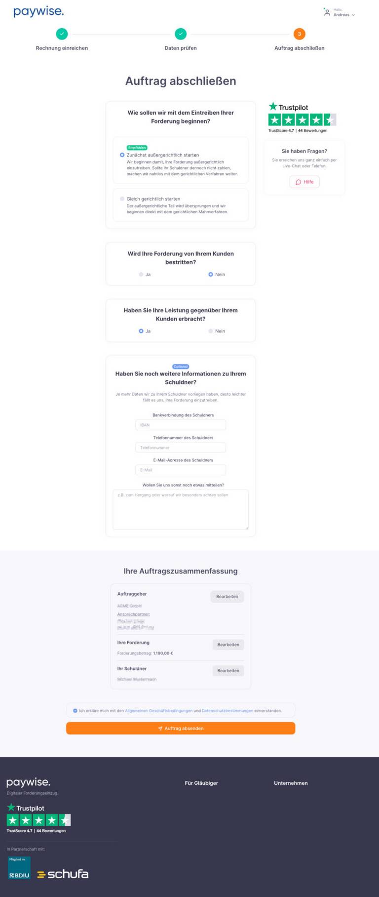 Außerdem musst du als Auftraggeber Unternehmer (§ 14 BGB) sein, um das Inkasso von paywise zu beauftragen.