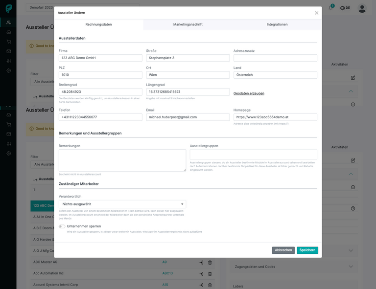 Aussteller können im Ausstellerbereich ihre Adressdaten und Ansprechpartner ergänzen, Branchendaten hinzufügen, Vorträge anmelden und ihren Katalog- bzw. Onlineeintrag vornehmen, der dann direkt im Ausstellerverzeichnis auf der Website sichtbar wird. - Bestellungen der Aussteller