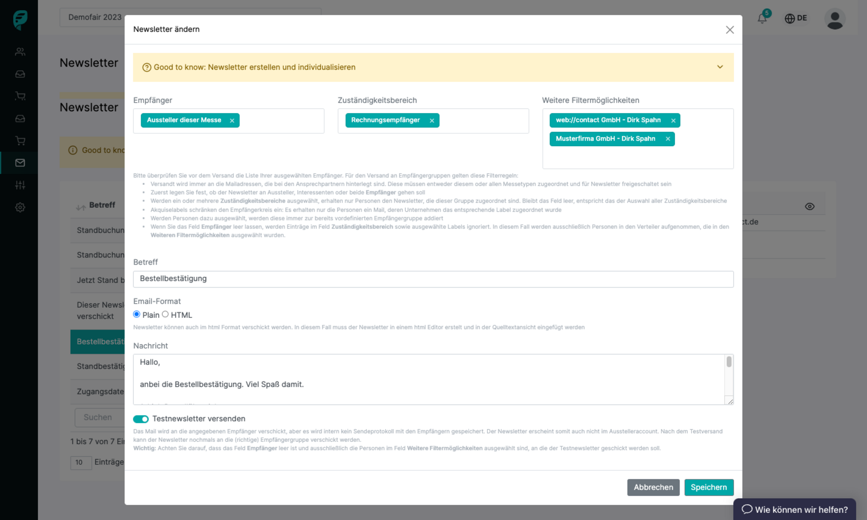 Verwaltung der Aussteller und deren Ansprechpartner sowie Zuordnung der Messestände. Direkte Kommunikation mit allen oder einzelnen Ausstellern über personalisierte und individualisierbare Newsletter. - Datenpflege durch die Aussteller