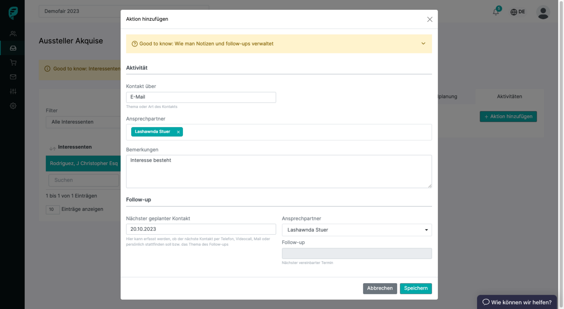Über ein individuell zugeschnittenes Anmeldeformular, die API oder über den interaktiven Hallenplan können potentielle Aussteller Infos anfordern oder sich verbindlich für die Messe anmelden. - Verwaltung von Ausstellern & Interessenten