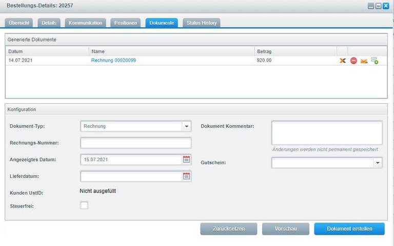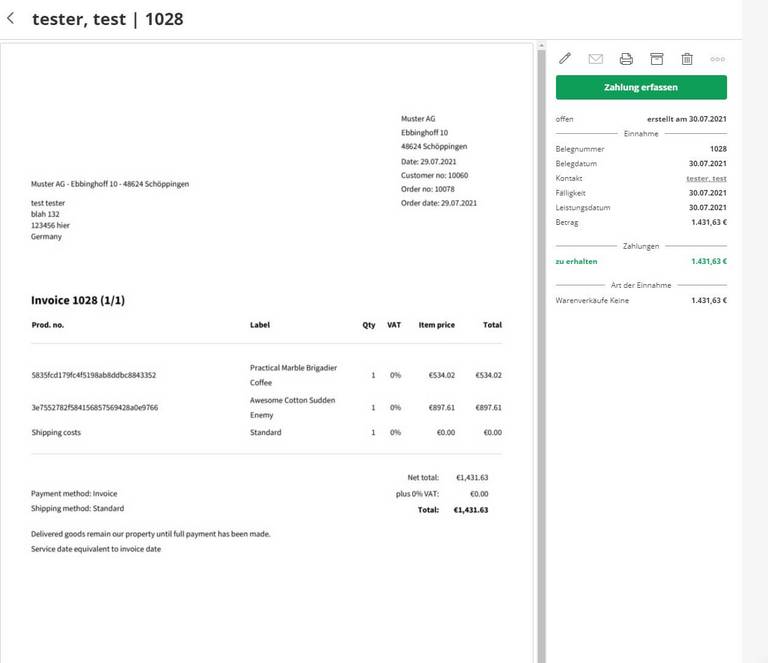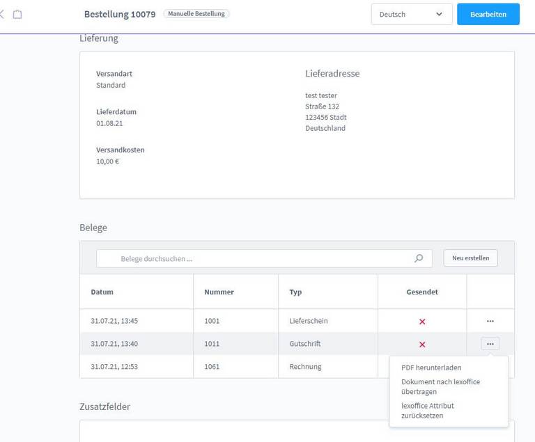 Kunden werden anhand der Bestelldaten in Lexware Office angelegt sofern noch nicht vorhanden. Das in Shopware erstellte PDF wird ebenfalls zu Lexware Office übermittelt.