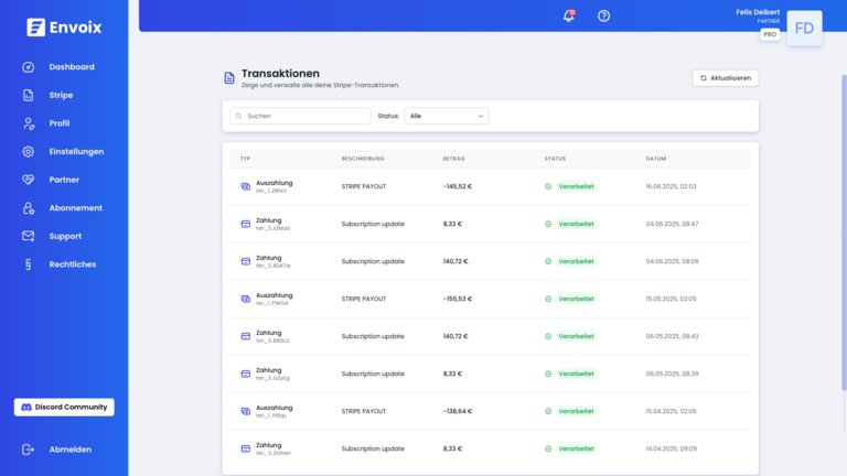Envoix verarbeitet nicht nur Einnahmen, sondern auch Auszahlungen, Rückerstattungen und die komplexe Struktur der Stripe-Gebühren. Das gewährleistet eine vollständige Transaktionshistorie.